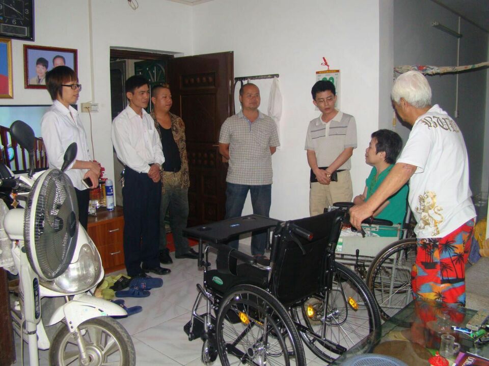2015年4月22日,我司董事长胡永、北湖安居小区业委会粟委员及北湖安居小区物业林经理等人到北湖安居小区贫困户家中走访慰问,并送去了轮椅和慰问金。
